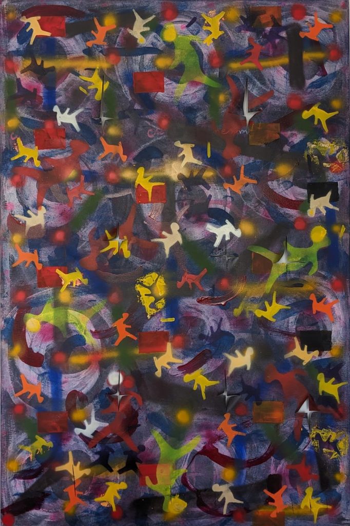 “In one installation 2200 tickets plaster a wall and onto each ticket, using a variety of media from ash to acrylic and collage Balanescu has worked a variation of the motif: Running Man. Originally inspired by the green man at pedestrian crossings meaning safe to cross, the motif has become representative for Balanescu of many things: the individual amongst the many; the striving for individuality amongst conformity; the constant running which is a human attribute; running always towards better, more,safety.”